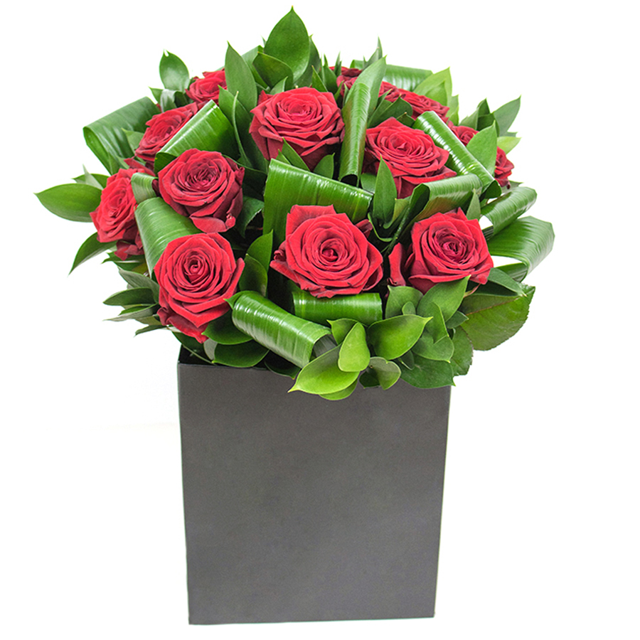 Delight in the unique allure of our bouquet featuring dazzling red roses, accompanied by graceful aspidistra leaves and ruscus. Meticulously arranged to radiate beauty and sophistication, this bouquet is perfect for those who cherish luxury in every detail.