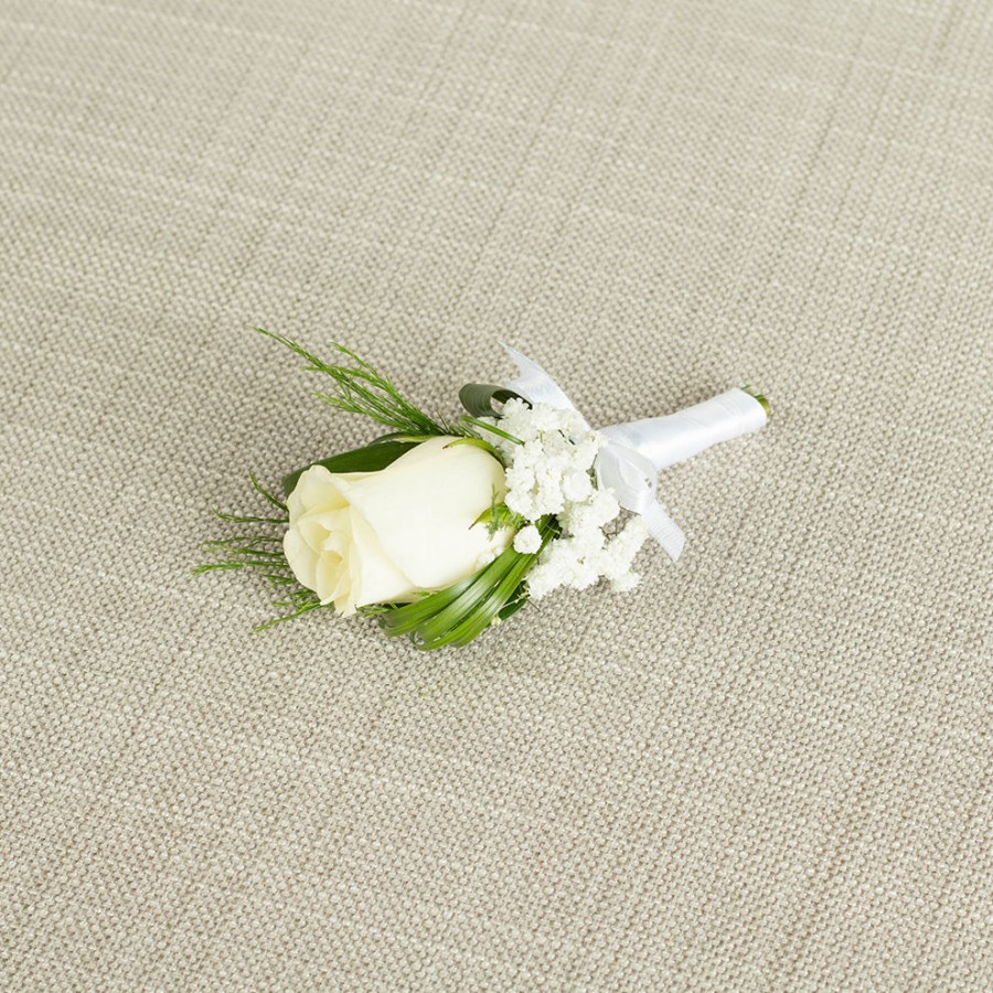 Accent your wedding suit with our elegant white rose buttonholes, crafted for grooms seeking sophistication.